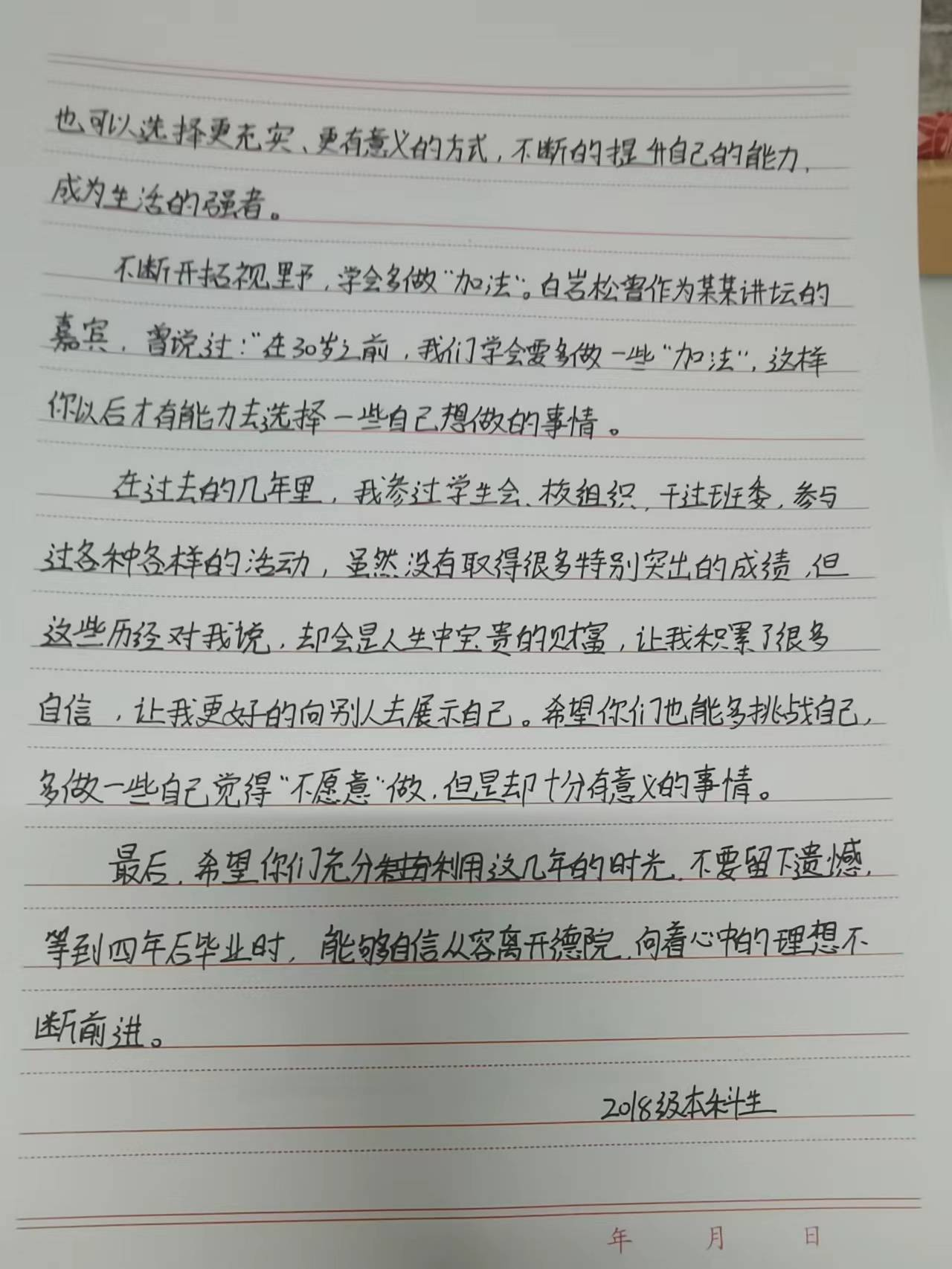 为更好传承德院学子的崇德品格,增进同窗情谊。bv1946伟德开展“一纸书信传真情”活动,组织毕业生以寝室为单位,为未来即将住进寝室的“新房客们”留一纸书信。