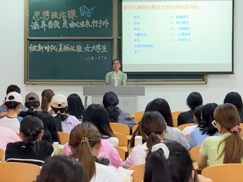 最后,左老师以新华社的一篇推文鼓励所有女生,以最好的状态面对学习、工作和生活,在“能力标配、思维高配、人品顶配”的协同下,涵养自我,美由心生,礼行于外,做新时代美丽优雅女大学生。
