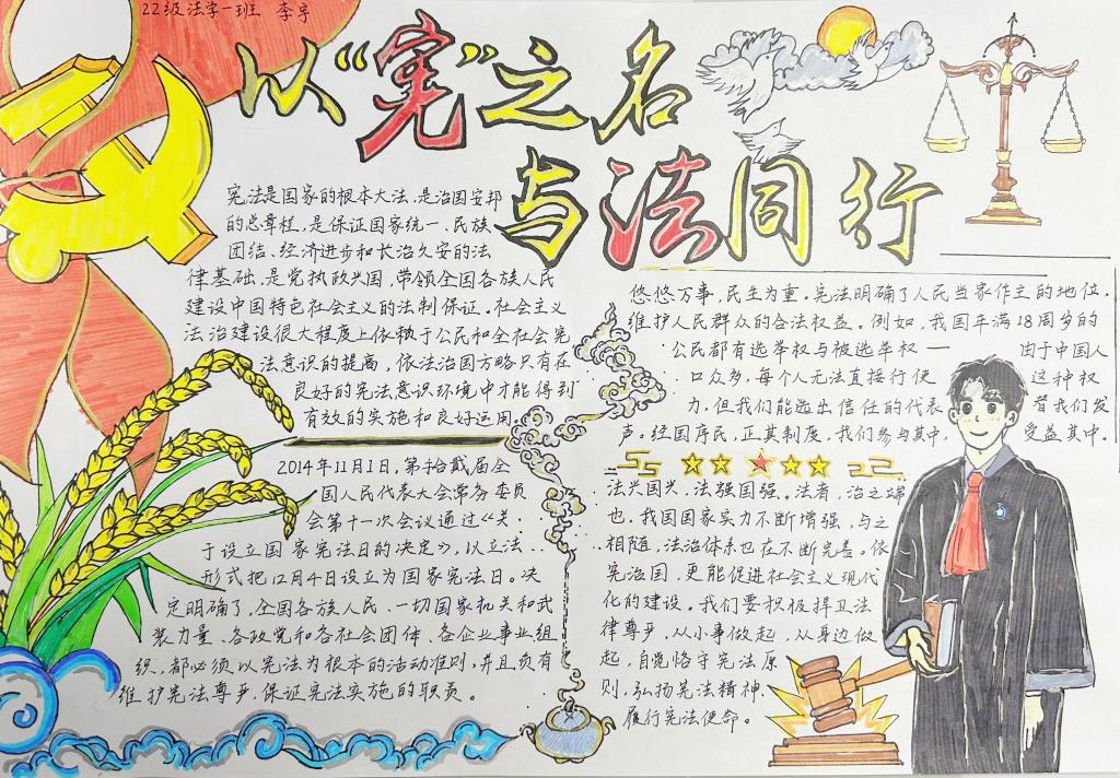 在我国第十个国家宪法日来临之际,为大力宣传以宪法为核心的社会主义法治体系,弘扬宪法精神、传播宪法文化,bv1946伟德于2023年12月4日至12月17日开展“遵纪守法,与法同行”手抄报征集活动。