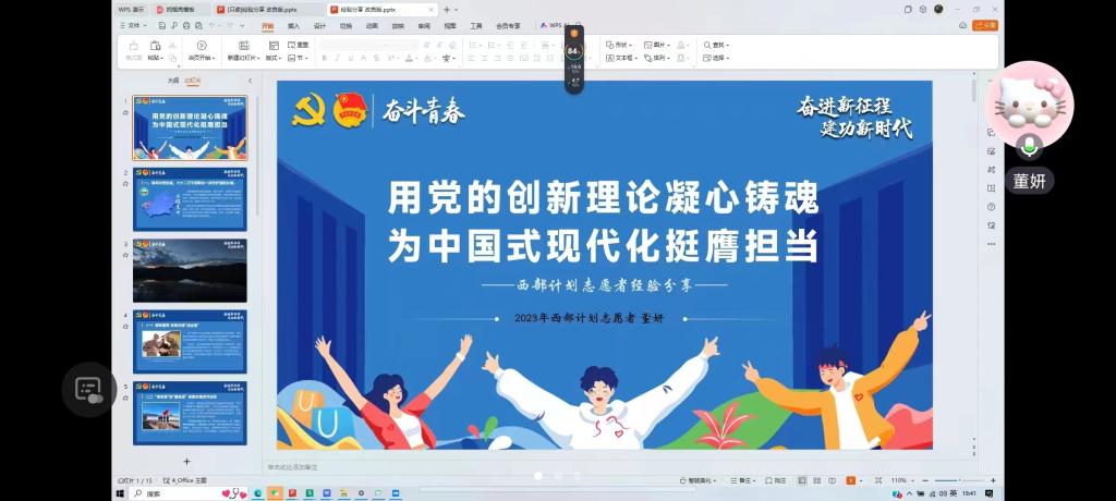 为引导和鼓励我院2024届毕业生践行志愿服务精神,积极参与到服务基层、奉献社会的行列中。bv1946伟德于2024年4月7日在博文楼427教室与腾讯会议共同举办“奉献西部,青春无悔”西部计划分享交流会,我院全体学生于线上线下共同聆听了本次分享会。
