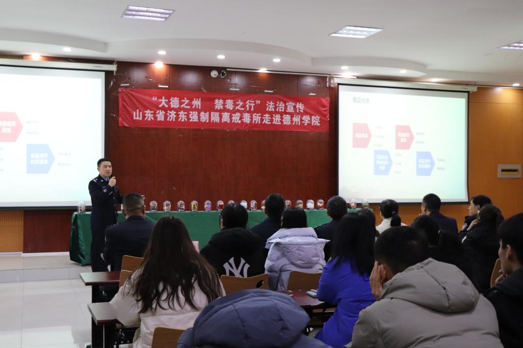 为加强校园毒品预防教育工作,增强学生识毒、防毒、拒毒意识,11月24日上午,山东省济东强制隔离戒毒所(以下简称戒毒所)二级高级警长刘序全一行9人来bv1946伟德开展“筑牢禁毒教育防线 护航无毒健康人生”法治宣传。学院200余名师生参加了活动。