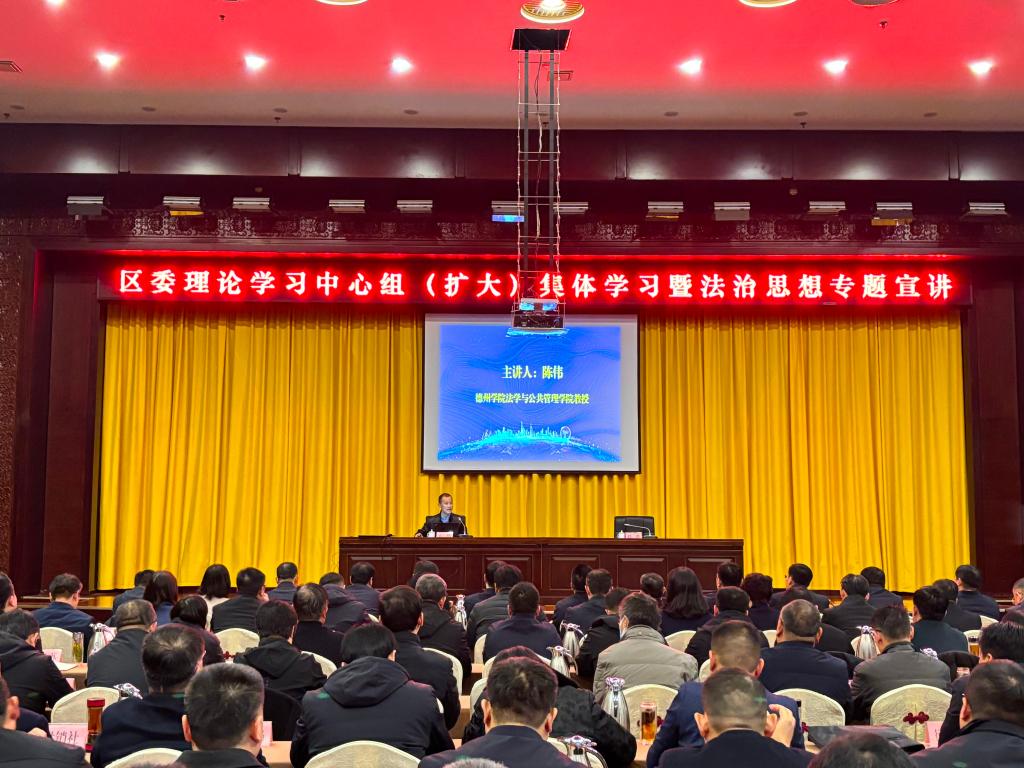 按照市全面依法治市办公室统一安排,12月11日,我院陈伟教授陵城区委理论学习中心组(扩大)集体学习会议作习近平法治思想专题报告。陵城区委常委、副区长任营主持会议,陵城区委区政府及各部门、各乡镇主要负责同志等300余人参加报告会。