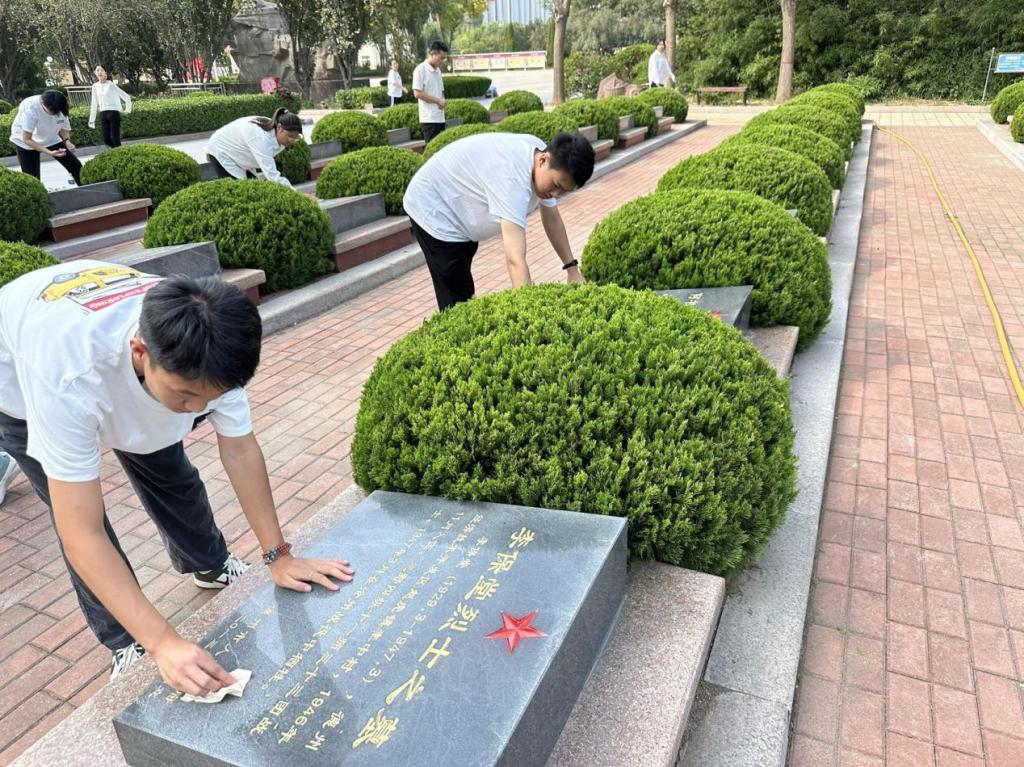 宣誓默哀仪式结束后,同学们分组开展了擦墓碑活动。他们认真细致地擦拭着每一块墓碑,清理着陵园内的杂草和垃圾。在擦拭过程中,同学们仔细阅读了墓碑上的烈士生平简介,了解了先烈们的英勇事迹和革命精神。