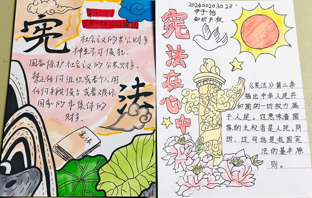 活动期间,博文楼休读点展板成为了同学们展示创意与才华的舞台。大家纷纷将自己精心制作的卡片钉在展板上,形成了一道亮丽的法治文化风景线。这些卡片不仅有工整的法条书写,更有精美的图案诠释。有的同学通过绘画法庭场景,展现宪法在司法实践中的权威;有的则以漫画形式,解读宪法赋予公民的权利与义务,让人一目了然。每一张卡片都凝聚着同学们对宪法的敬畏之心,也体现了他们在法治学习中的独特收获,这些优秀作品将成为学院法治教育的生动教材,供更多同学学习与借鉴。参与者们纷纷表示,此次活动让他们感受到,宪法不再是书本上的生硬条文,而是与生活息息相关的行为准则,是保护大家权益的有力武器。