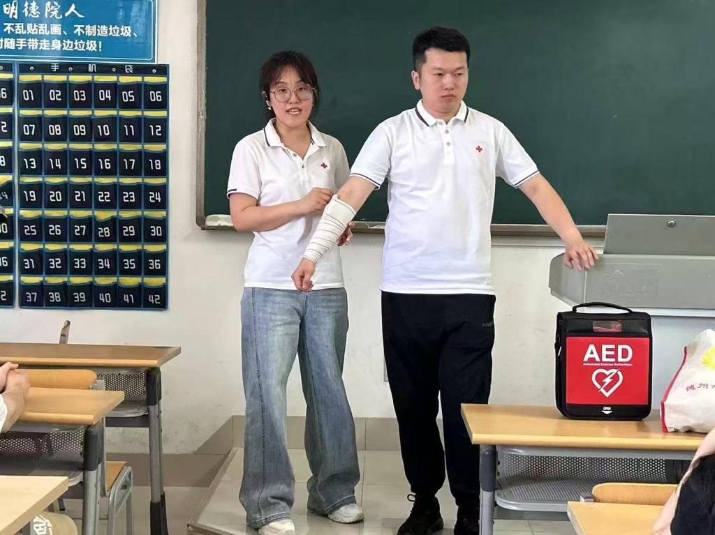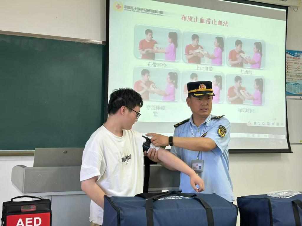 此次实训分为理论学习、线下实操考核两个部分。首先,老师分别对心肺复苏术、AED使用、气道异物梗阻急救、创伤救护等知识进行了系统讲解,并向同学们演示了心肺复苏术、AED使用、气道异物梗阻急救、创伤救护等紧急救护技术。最后,学生分组进行实操,各位老师严把教学质量关,逐一纠正学员的演练动作,确保学员熟练掌握应急救护技能。
